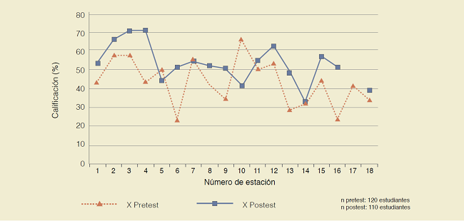 En algunas estaciones se observa un aumento en la calificación por estación de hasta casi 30 puntos porcentuales (estación 6 y 16); en otras como la estación 14, la diferencia entre medias es de 20 puntos porcentuales, y aunque menor, sigue siendo una diferencia relevante. En el pretest las medias oscilan entre 23 y 66%, y en el postest van de 42 a 71%.