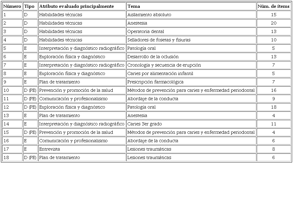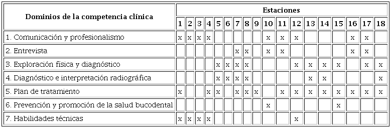 Para elaborar las estaciones, se tomó en cuenta la metodología para la elaboración de un examen propuesta por Haladyna y Downing10 fundamentada en los estándares para pruebas psicológicas y educativas emitidos por la American Educational Research Association (AERA por sus siglas); asimismo se construyó una matriz de competencias que describía los siete dominios de la competencia clínica que fueron evaluados en los estudiantes, así como los temas que abarca el programa de la asignatura. Tales dominios fueron: (1) comunicación y profesionalismo, (2) entrevista, (3) exploración física y diagnóstico, (4) diagnóstico e interpretación radiográfica, (5) plan de tratamiento, (6) prevención y promoción de la salud bucodental y (7) habilidades técnicas. Se eligieron con base en una búsqueda de la literatura11,12,13,14,15,16, y en la opinión de docentes especialistas en odontopediatría, quienes además fueron capacitados en un taller para diseñar las estaciones y desempeñar su papel como evaluadores en el examen.