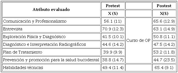 La media de las calificaciones en la prueba pretest fue de 44% y en el postest, de 54% que representan una diferencia de diez puntos porcentuales. Era esperado un aumento de las medias después del curso de Odontopediatría, pero se podría esperar que fuera aún mayor. Al hacer el análisis por estación, también se observa, en la mayoría, un aumento de las medias de las estaciones, pero existen variaciones entre unas y otras.
