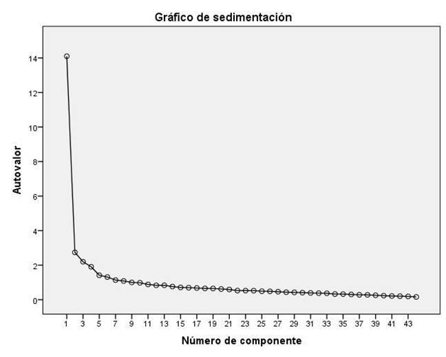 El primer AFE mostró una agrupación de los 50 ítems en 11 componentes con autovalores mayores que 1. El primer componente tuvo un autovalor de 14,762 (aportando el 29,525 de la varianza), y los siguientes diez tuvieron autovalores entre 2,909 y 1,045. Los once componentes en conjunto aportaron una varianza del 61,374%. En el gráfico de sedimentación, la curva de inflexión se ubicó en el componente cinco (Figura 2). Por tanto, se decidió realizar un segundo AFE con límite de cinco componentes.