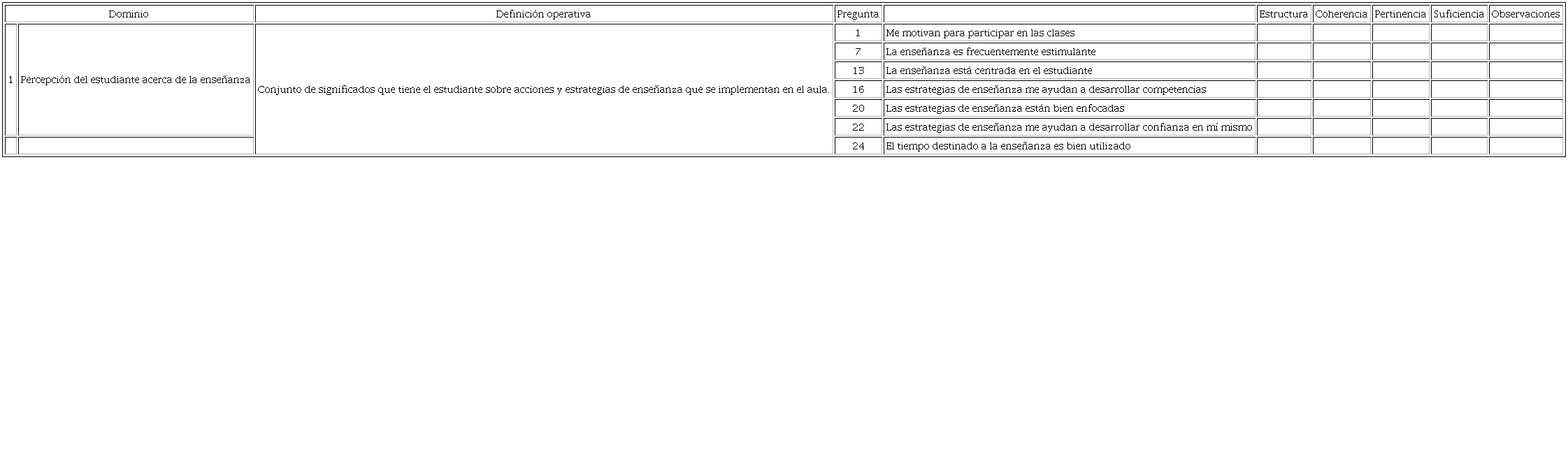 Para la validación de contenido, se usó el análisis por jueces expertos. Veinte jueces fueron escogidos con base en estos criterios: ser profesor universitario con más de tres años de experiencia, tener formación postgradual en educación y haber realizado investigación en validación de instrumentos de medición. Cada uno recibió una carta de presentación, un instructivo y una rejilla para calificar estructura gramatical, coherencia semántica, pertinencia y suficiencia de cada ítem en una escala de 1 a 3, correspondiendo 1 al bajo nivel de cumplimiento, 2 a un nivel moderado y 3 a un alto nivel. La rejilla contenía un espacio reservado para observaciones (Tabla 2).