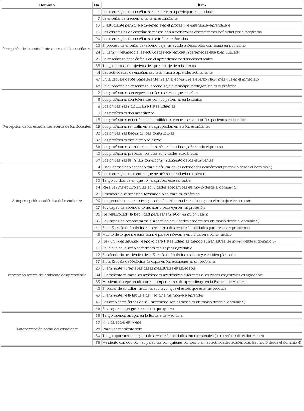 Resultados: Se adecuaron sintáctica y semánticamente los ítems y se movilizaron siete ítems de un dominio a otro. El puntaje total del DREEM mostró un nivel de confiabilidad excelente (α = 0,91), pero dos de sus dominios tuvieron un nivel cuestionable de consistencia interna. La validez de constructo indicó que 26 ítems serían suficientes para medir el ambiente educativo. Los ítems del dominio cinco y el ítem 17 quedaron excluidos del AFE.