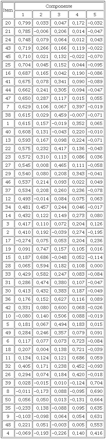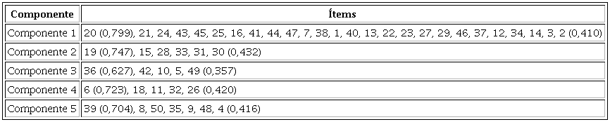 En el segundo AFE, los cinco componentes tuvieron autovalores mayores que 1. El primero, un autovalor de 14,762 (aportando el 29,525 % de la varianza) y los siguientes cuatro, obtuvieron autovalores entre 2,909 y 1,482. Los cinco componentes aportaron una varianza del 47,038%. En los cinco componentes se evidenció que la carga factorial de cada uno de los ítems constitutivos fue mayor a 0,3, lo que indicó parsimonia. En la Tabla 4 se presenta la distribución de los ítems de acuerdo con cada componente.