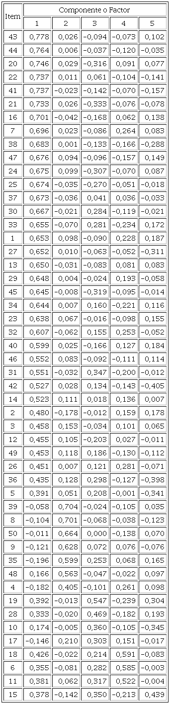 Los resultados obtenidos del segundo AFE fueron consistentes con el cuestionario de Roff et al. en su composición por cinco dominios; sin embargo, la carga factorial de los ítems fue mayor para el componente uno, el cual recogió 35 de los 50 ítems (70%), sin la rotación Varimax, pero el ítem 15 fue el único constituyente del quinto componente. Posterior a la rotación Varimax, 26 de los 50 ítems (52%) se ubicaron en el componente uno lo que mostró correlaciones más altas entre los ítems para este solo componente. Al revisar solamente la matriz de componentes, sin la rotación Varimax, los ítems 5, 10, y 17 presentaron cargas factoriales inferiores a 0,3. En la matriz de componentes rotada estos ítems obtuvieron valores mayores a 0,3, pero continuaron siendo los más bajos dentro de cada componente. La información de las Tablas 5 y 6 corresponde a los datos obtenidos del segundo AFE antes y después de la rotación Varimax.