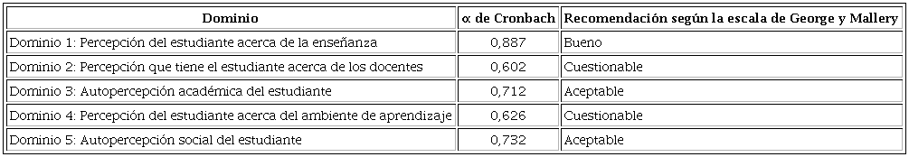 Esta investigación buscó determinar la confiabilidad y validez del DREEM para el español colombiano y para un currículo integrador. Por una parte, la confiabilidad del DREEM fue definida por el α de Cronbach con un valor de 0,914 correspondiente a un nivel de recomendación excelente para el instrumento de 50 ítems, de acuerdo con la escala de George y Malery24, por lo que se puede considerar que los ítems del DREEM son confiables. Este hallazgo coincide con los resultados de otros investigadores como Riquelme et al. cuyo hallazgo fue de 0,9119 y Aguilar-Barojas, Jiménez-Sastré y Castillo-Orueta quienes obtuvieron un coeficiente de 0,9325. La obtención del α de Cronbach por dominio mostró resultados variables entre ellos, lo cual indica que no son independientes - como lo asumieron teóricamente sus creadores - y que los dominios dos y cuatro (docentes y ambiente) no pueden usarse de manera fiable. Estos hallazgos se encuentran relacionados con los de Riquelme et al., quienes encontraron un α inferior a 0,7 en dos dominios, el tres y el cinco19; con el de Aguilar-Barojas, Jiménez-Sastré y Castillo-Orueta que encontraron un coeficiente α de 0,56 en el dominio cinco 25. Se observa mayor coincidencia con los resultados de Ortega et al., quienes encontraron un coeficiente α de 0,50 en el factor IV, relacionado con las percepciones de los estudiantes sobre los docentes 26.