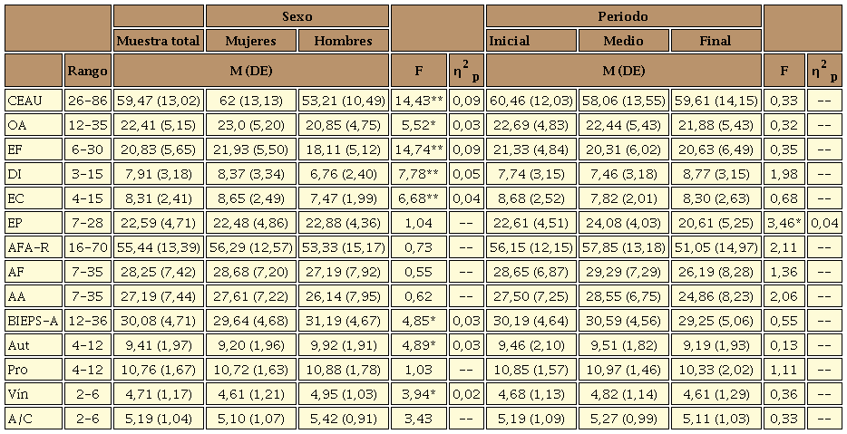 La Tabla 1 muestra los puntajes para cada instrumento. En comparación con los hombres, las mujeres mostraron mayor puntaje en el CEAU y sus dimensiones y menor puntaje en la escala BIEPS-A y sus dimensiones Autonomía y Vínculos. Además, las mujeres del periodo final de formación académica mostraron el menor puntaje en la EP. El tamaño de efecto en tales diferencias osciló entre pequeño y mediano.