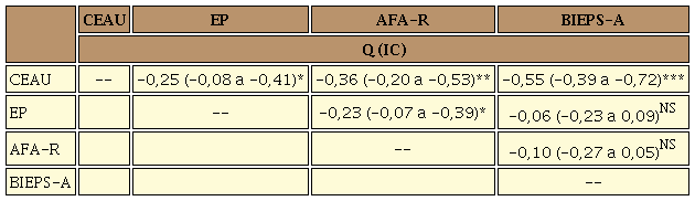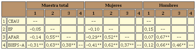 La Tabla 2 indica una correlación positiva de media a alta entre las escalas EP, AFA-R y BIEPS-A, misma que se mantiene en los análisis por sexo. En la muestra total y en mujeres el CEAU correlacionó negativamente con la escala BIEPS-A. Para estas últimas se detectó también una correlación negativa entre el CEAU y la AFA-R. Estas últimas correlaciones fueron de baja a media.