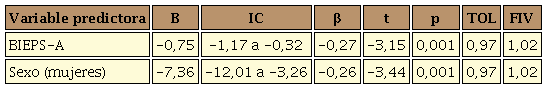 Debido a la muy alta correlación entre las escalas BIEPS-A y EP, está última fue retirada del modelo regresión lineal para evitar problemas de colinealidad. La Tabla 4 muestra los resultados del modelo. Las variables sexo y puntaje obtenido en la escala BIEPS-A fueron retenidas como predictoras del puntaje del CEAU. El modelo explicó el 15% de la varianza (R2 corregida = 0,15), cumplió supuestos de linealidad [F(2, 143) = 14,25, p < 0,01], no colinealidad (TOL y VIF), no autocorrelación (Durbin-Watson = 2,22), distribución normal de residuos (S-W = 0,99, p > 0,05), y sin valores de influencia (Distancia de Cook < 1).