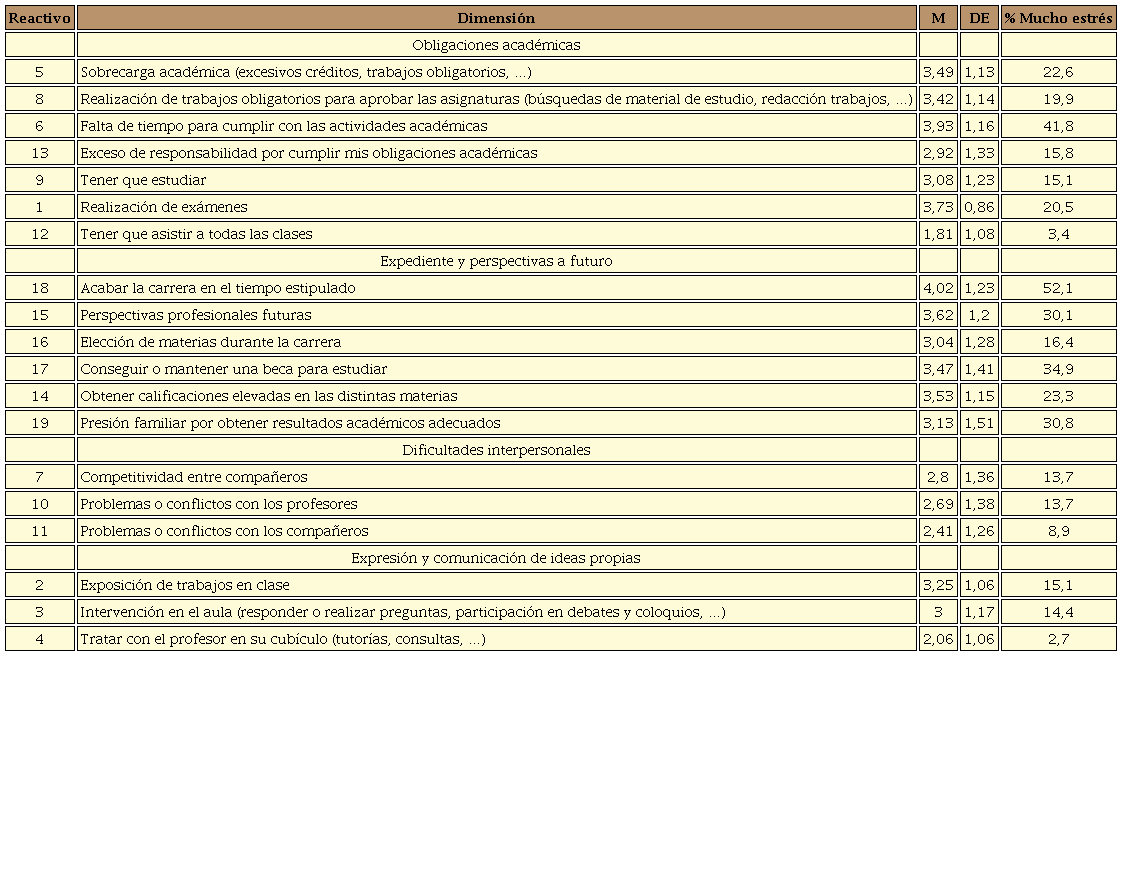 La Tabla 5 muestra los eventos que más estrés generan en los estudiantes. Destaca que de los 5 primeros, cuatro se encuentran en la dimensión Expediente y perspectivas a futuro y solo uno en la dimensión Obligaciones académicas.