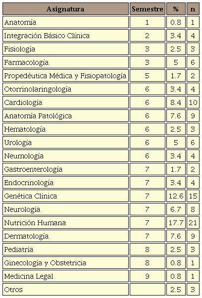 De 120 encuestas, se incluyeron 119 correspondientes a estudiantes matriculados de primero a sexto año de medicina, 60.5% (n=72) del género femenino y 39.5% (n=47) del masculino. La media de edad fue de 21.2 ± 1.2 (rangos 18 a 25) años. La mayoría de los alumnos se encontraban cursando el sexto y séptimo semestre en 30.3% y 49.7% respectivamente, seguidos por alumnos del tercero y segundo semestre. Los porcentajes y número de alumnos encuestados en cada semestre y asignatura se muestran en la Tabla 1.