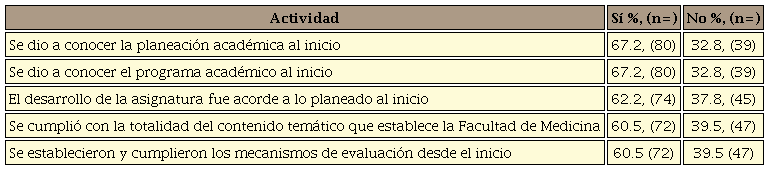 Resultados: 119 alumnos, 60.5% del género femenino y 39.5% masculino. El promedio de plataformas virtuales utilizadas fue de 2.7 ±1.1, las más comunes: Zoom, Google Classroom y Edmodo. El acceso a información actualizada, la posibilidad de organizar el tiempo y el ahorro económico se describieron como fortalezas. La ausencia de práctica clínica y el no poder establecer una relación médico-paciente como debilidades. Los problemas detectados fueron: falta de acceso o pobre conexión a internet, horarios de clases traslapadas y atraso en la retroalimentación de tareas o dudas. El 67.2% tuvo conocimiento de la planeación, desarrollo y evaluación de la asignatura. De las APROC el 76.9% se ubicó en el Q3, el 15.4% en Q2 y el 7.7% en el Q1.