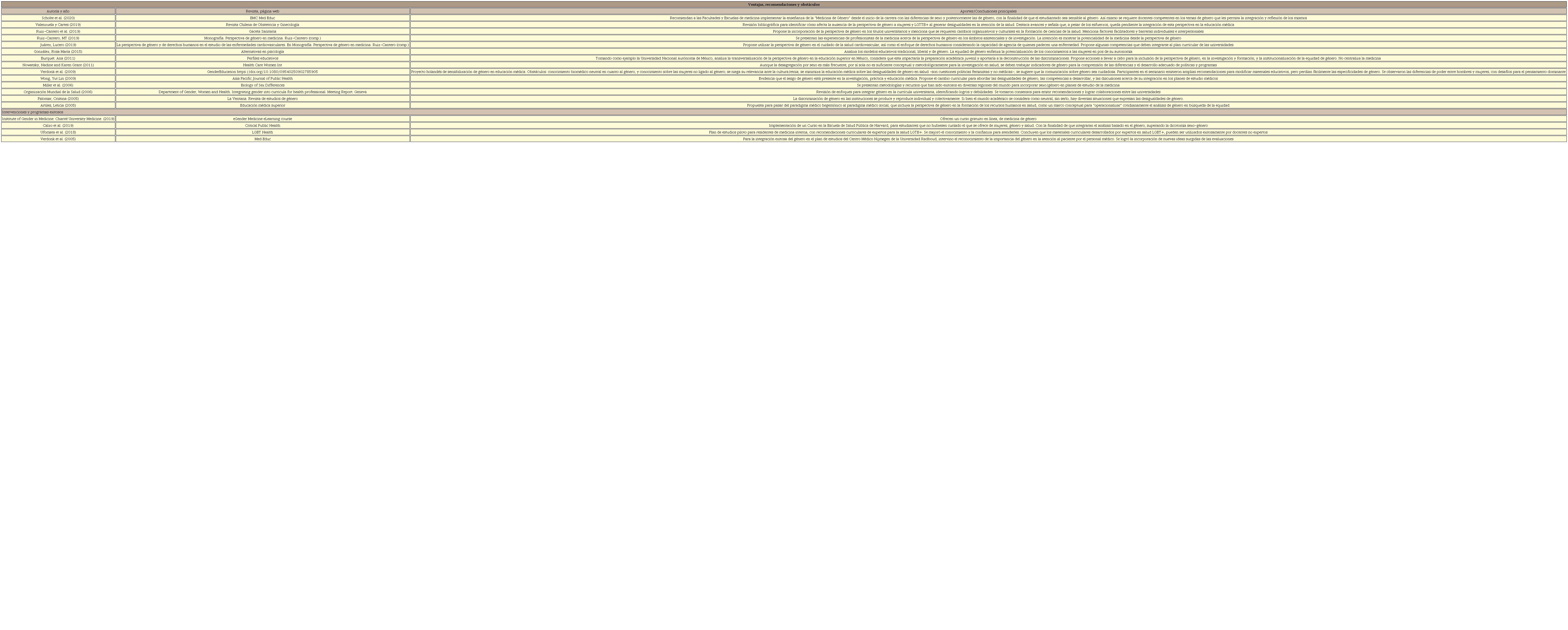 En México hay iniciativas para incorporar la perspectiva de género en las instituciones de educación superior (tabla 1)36-38 Con ellas se busca dar cumplimiento a las disposiciones acordadas en la Conferencia Mundial de Educación Superior, que desde 1998 señaló el rol de la educación superior en la resolución de las disparidades de género,39 esto lleva aparejado los marcos de derechos, multiculturalidad y respeto a la diversidad.