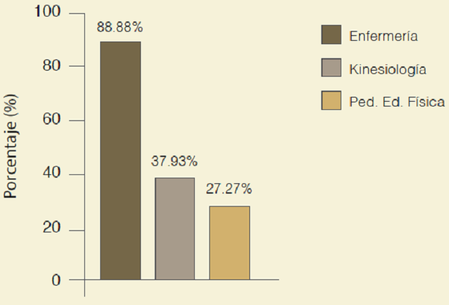 La metodología consideró una encuesta personal, anónima y voluntaria aplicada a estudiantes (N = 71) de noveno semestre de las carreras de Enfermería (n = 9), de Kinesiología (n = 29) y de Pedagogía en Educación Física, Deporte y Recreación para Enseñanza Básica y Media (n = 33) de la Universidad Bernardo O’Higgins, institución de educación superior privada acreditada, ubicada en Santiago, Chile. Como resultado, se logró encuestar a los 71 estudiantes, quienes, ante la pregunta ¿Considera usted que la enseñanza sobre reproducción masculina fue adecuada durante su formación universitaria?, respondieron de la siguiente forma: un 88,88 % de Enfermería, un 37,93 % de Kinesiología y un 27,27 % de Pedagogía en Educación Física considera que la enseñanza sobre reproducción masculina ha sido adecuada durante su trayecto formativo (Figura 1). Se concluye que, si bien la mayoría de los estudiantes de Enfermería respondieron que los contenidos de reproducción masculina y tópicos relacionados fueron enseñados de forma adecuada durante su trayecto formativo, no todos los estudiantes piensan lo mismo y, probablemente, no conocen bien estos temas, especialmente en las carreras de Kinesiología y Pedagogía en Educación Física.