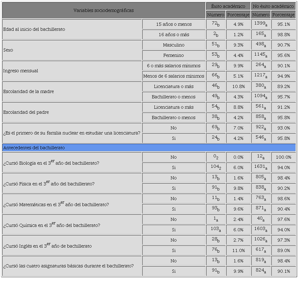 Para el análisis bivariado se calculó Xi2 con un nivel de significancia del 95%. La mayor proporción de alumnos con éxito académico se encontraba entre los que ingresaron de 15 años o menos al bachillerato (4.9% vs 1.2%), que pertenecían al sexo masculino (9.3% vs 4.4%), cuyos ingresos mensuales de la familia eran de 6 salarios mínimos o más, con escolaridad de la madre y/o del padre de licenciatura o más.