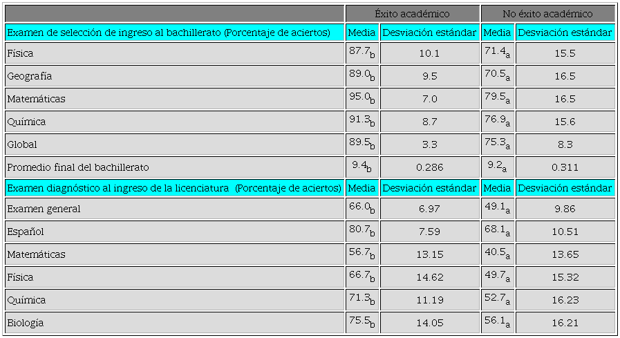El promedio de calificación durante el bachillerato (ver Tabla 2) obtenido por los estudiantes con éxito académico fue significativamente mayor en las áreas de física (87.7% vs 71.4%), geografía, matemáticas (95.0% vs 79.5%), química (91.3% vs 76.9%) y en el resultado global del examen de selección al bachillerato (89.5% vs 75.3%), así como en el examen diagnóstico global (66.0% vs 49.1%) y en las áreas de español (80.7% vs 68.1%), matemáticas (56.7% vs 40.5%), física (66.7% vs 49.7%), química ( 71.3% vs 52.7%) y biología (75.5% vs 56.1%) de este mismo examen. La diferencia observada en el promedio general del bachillerato también fue estadísticamente significativa (9.4 vs 9.2).