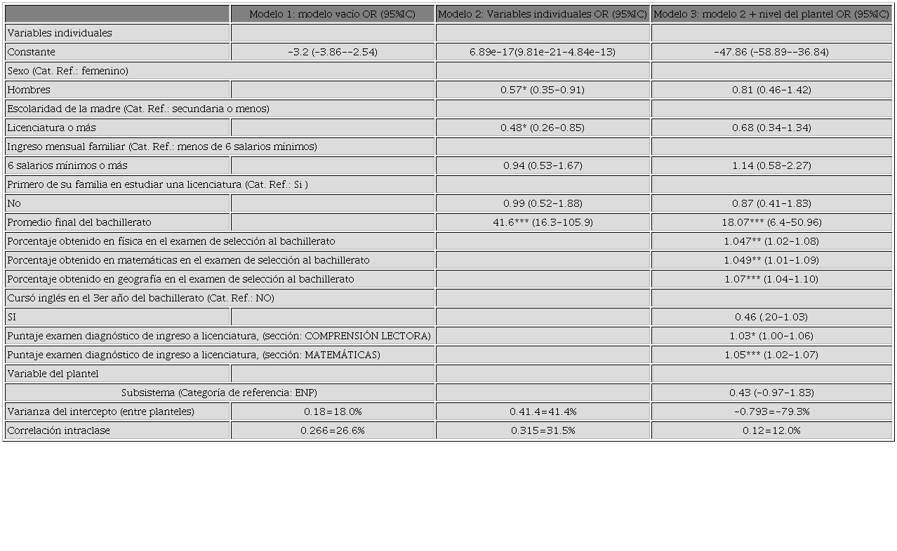 Mediante el modelo vacío se corroboró si el análisis multinivel era el más adecuado en comparación con una regresión logística. El modelo fue estimado usando cuadratura de Gauss-Hermite con adaptación basada en el promedio y la varianza. En la Tabla 3 se muestran los valores de los coeficientes en la parte fija y los valores de la parte aleatoria del modelo, también se expresan las razones de momios para cada categoría. En el modelo 2 se incluyeron solamente las variables individuales del estudiante, el sexo resultó con diferencias significativas y riesgo de “no éxito académico” para el sexo femenino. También resultó significativo el antecedente de que la madre tuviera escolaridad de licenciatura o más, así como el promedio final del bachillerato.