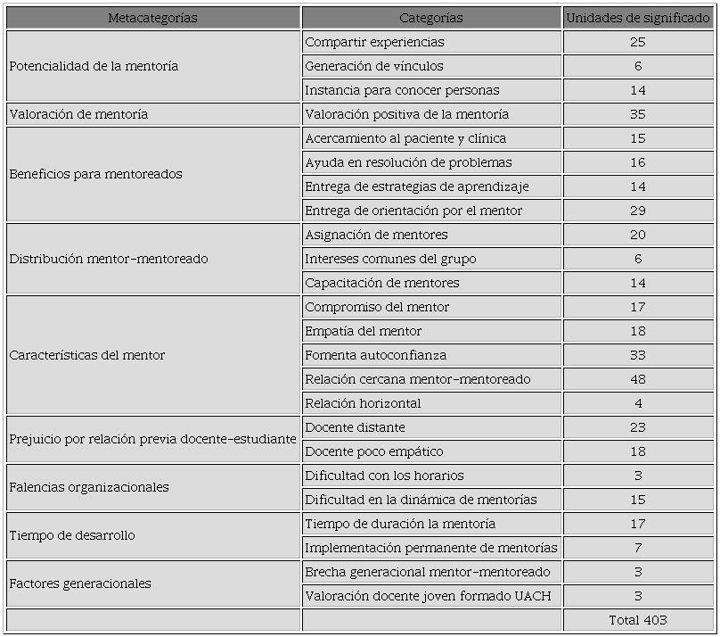 Resultados: Se identificaron 403 unidades de significado, 24 categorías descriptivas, agrupadas en 9 metacategorías, emergiendo 3 dominios “significado de las mentorías”, “relación mentor-mentoreado”, “factores influyentes en el desarrollo del programa”.