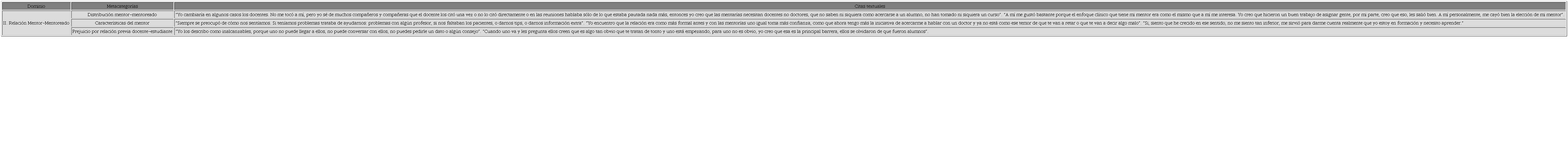 Se identificaron tres dominios cualitativos, los que dan respuesta a los objetivos planteados en el estudio: “significado de mentorías” (Tabla 2), “relación mentor-mentoreado” (Tabla 3) y “factores influyentes en el desarrollo del programa” (Tabla 4), las que señalan los dominios cualitativos, las metacategorías y algunas citas textuales que lo representan.