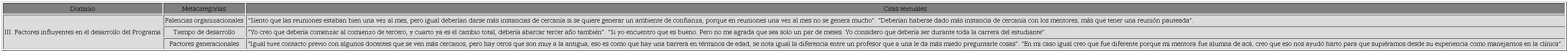 Los “factores influyentes para el desarrollo del programa”, hacen relación que a pesar de que la gran mayoría de las experiencias de los mentoreados fueron evaluadas como positivas, reconocen que existen ciertos factores que pudieron hacer que esta experiencia no sea tan satisfactoria como por ejemplo la dificultad con los tiempos, ya que no existió un horario resguardado para docentes y estudiantes de dedicación al programa, por lo que en ocasiones fue difícil coordinar o brindarle el tiempo suficiente. Otro factor determinante para el éxito de la mentoría fue la dinámica de las mentorías, ya que cuando se daba fluida y distendida era mejor considerada por los estudiantes, que una mentoría estructurada y rígida, que no generaba vínculos tan potentes ni espacios abiertos para el diálogo.