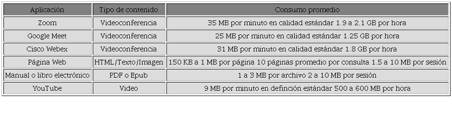 En los últimos meses han aparecido literalmente miles de sugerencias, tutoriales, videos, instrucciones y recomendaciones para el uso de Zoom y sus equivalentes en la pandemia, muchas de ellas redundantes y repetitivas. En este escrito no se pretende dar instrucciones sobre los aspectos técnicos de Zoom, para ello se refiere al lector al sitio de ayuda de la plataforma en https://support.zoom.us/hc/es/categories/200101697. Aunque Zoom es compatible con todos los sistemas operativos y se puede usar en todo tipo de dispositivos digitales, tiene requisitos mínimos para tener una buena experiencia, se sugiere al lector revisar el siguiente material: https://www.highspeedinternet.com/resources/zoom-guide . La Dirección de Cómputo y Tecnologías de Información y Comunicación (DGTIC) de la UNAM generó el siguiente listado del consumo de datos por tipo de aplicación (Tabla 1):