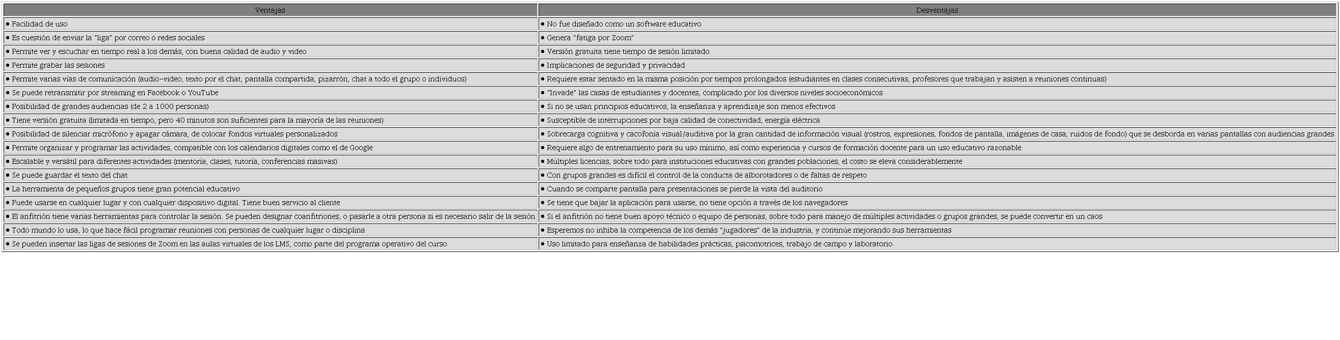 En este apartado comentaremos algunas de las ventajas y limitaciones de la plataforma, obtenidas de la revisión de la literatura, así como de experiencias institucionales y personales. Es importante considerar que lo que para alguien puede ser una ventaja para otro será una limitación, o la misma opción de Zoom puede ser buena en un contexto y no tanto en otro, por lo que el listado siguiente no es prescriptivo ni exhaustivo (Tabla 2). Por otra parte, con el intenso cambio educativo durante la pandemia las limitaciones y bondades de la educación en línea han sido muy aparentes y se han comentado en múltiples artículos y conferencias, por lo que aquí nos limitaremos a la plataforma de Zoom en particular, sin entrar en detalle sobre las ventajas inherentes a la educación a distancia per se.