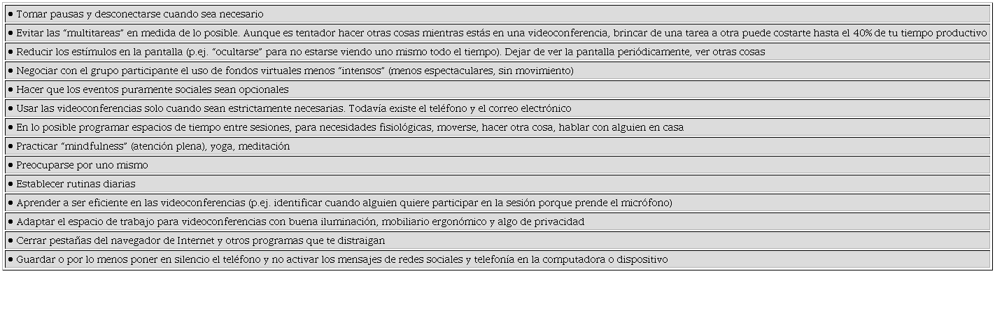 Con el paso del tiempo de la pandemia se ha identificado una nueva entidad que afecta con frecuencia a los usuarios de Zoom, la “fatiga por Zoom” 12,13. Los que hemos vivido durante las prolongadas y frecuentes, a veces “espalda-con-espalda”, sesiones de trabajo y de enseñanza en Zoom, identificamos fácilmente los síntomas como un tipo de desgaste y cansancio que no habíamos experimentado antes de la pandemia. Participar en sesiones de videoconferencias, clases o reuniones de trabajo, no se sienten igual que atender reuniones o dar clases cara-a-cara, lo que genera fatiga y disminución de la reserva mental para atender adecuadamente los retos y actividades que tenemos como docentes y profesionales de la salud.