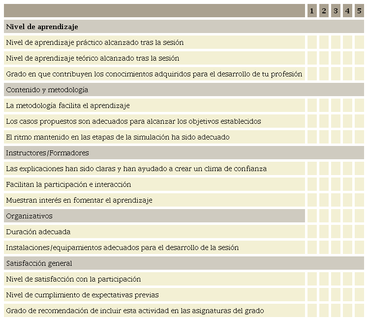 Las experiencias se realizaron en las instalaciones del Instituto Bonanova, un centro de simulación de alta fidelidad equipado con maniquí y con todo el instrumental necesario para resolver los casos presentados. Al acabar cada experiencia, los estudiantes, de forma voluntaria y anónima, contestaron un cuestionario de 14 ítems tipo Likert con 5 alternativas. Éste contenía ítems sobre percepción de aprendizaje y de utilidad de la experiencia, valoración de los instructores, aspectos organizativos, satisfacción de haber participado en la experiencia y la posibilidad de extensión de la EIP en los estudios reglados (anexo 1). En la segunda prueba piloto, 3 de los 14 ítems fueron diferentes a los de la primera.