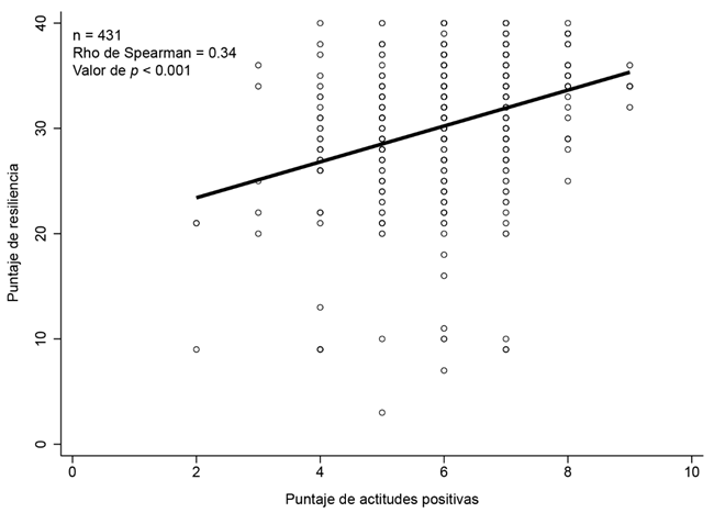 El diagrama de dispersión mostró una correlación positiva, baja pero altamente significativa entre el puntaje total de resiliencia y el puntaje total de actitudes positivas, Rho de Spearman = 0.34, p < 0.001 (figura 1).