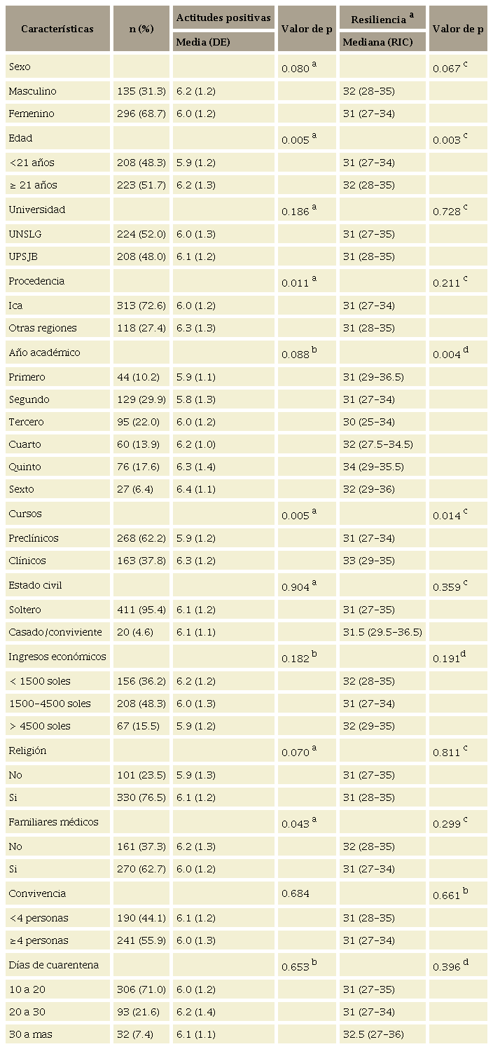 Los estudiantes con 21 o más años y los que cursaban los años académicos superiores tuvieron puntajes más altos de actitudes positivas y de resiliencia. Asimismo, aquellos estudiantes con actitudes positivas hacia la pandemia tuvieron medianas más elevadas de resiliencia, en comparación con aquellos estudiantes con menores actitudes positivas. Los puntajes de actitudes positivas se correlacionaron significativamente con los puntajes de resiliencia.
