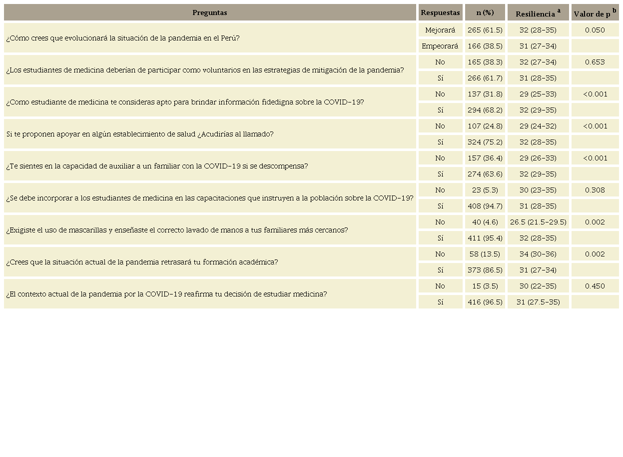 En general, la mayoría de los estudiantes respondieron de forma positiva a todas las preguntas relacionadas a las actitudes hacia la pandemia. Las medianas de los puntajes de resiliencia fueron estadísticamente mayores en los estudiantes con actitudes positivas frente a la pandemia (tabla 2).