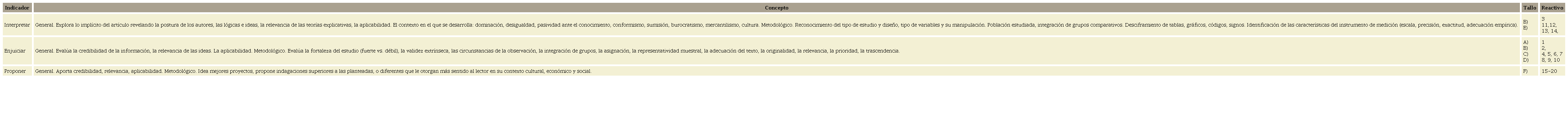 Del resumen se elaboran tallos, que agrupan aspectos relacionados para grupos de reactivos que exploren interpretación, juicio y propuestas, que son referidos más ampliamente en la tabla 1 con letras mayúsculas.