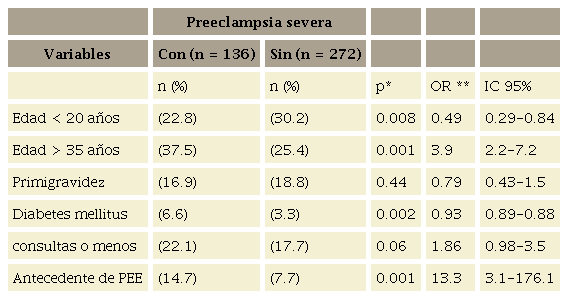 En Perú, la preeclampsia severa (PEES) es la causante de 12.7% de las muertes maternas, por lo que se busca identificar sus factores predisponentes. Se realizó un estudio de casos y controles en dos hospitales. Los casos fueron las embarazadas hospitalizadas con criterios diagnósticos de PEES con tensión arterial arriba de 160-110 mmHg. Los controles fueron las embarazadas sin este diagnóstico. Se estudiaron varios factores como edad (<20 o >35 años), preeclampsia previa y diabetes mellitus, primigravidez, 5 o menos controles prenatales, estrés y ansiedad (reportes de psicología) entre otros. Todos los datos se obtuvieron de los registros médicos. El tamaño muestral se determinó con α = 95%, ß = 80%, proporción de casos expuestos de 35% y proporción de controles expuestos de 21%, con dos controles por caso (128 casos y 255 controles). Se realizó un muestreo probabilístico, aleatorio, simple. El instrumento de recolección de datos se conformó con preguntas cerradas dicotómicas y politómicas. Se usó razón de momios (RM) e intervalo de confianza del 95% para medir la asociación y el análisis multivariado. Resultados: Se incluyeron 408 participantes: 136 casos y 272 controles. Los resultados de algunos factores PEES se muestran en la tabla 1. Discusión: El cuidado prenatal deficiente (consultas prenatales 5 o menos) fue un cercano factor de riesgo. Algunos reportes refieren que la contaminación ambiental, la ansiedad y el tráfico vehicular son factores para la aparición de preeclampsia. Se encontró poca evidencia de PEES y pudo haber sobreestimación de casos. Conclusiones: Entre otros factores la diabetes mellitus se encuentra como factor protector.