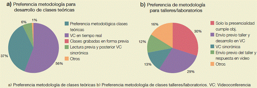 Las metodologías de clases se dividieron en: clases teóricas, las que corresponden a sesiones expositivas o cátedras; y en talleres/laboratorios, los cuales tienen incorporadas prácticas donde se fomenta el trabajo grupal y el autoaprendizaje. En la figura 1, se observa que frente a la consulta de ¿qué metodología prefieren para las clases teóricas?, el 56% se inclina por las videoconferencias en forma sincrónica (figura 1A). Como complemento, los estudiantes refieren que la grabación de las clases les permite realizar una revisión posterior, lo cual facilita el aprendizaje y el manejo del ritmo de estudio (datos no mostrados). En el caso de los talleres/laboratorios, aunque el 30% de los estudiantes indica que la metodología online no sustituye a las actividades prácticas presenciales, el 29% prefiere el envío del material con posterior revisión con videoconferencia en tiempo real (figura 1B).