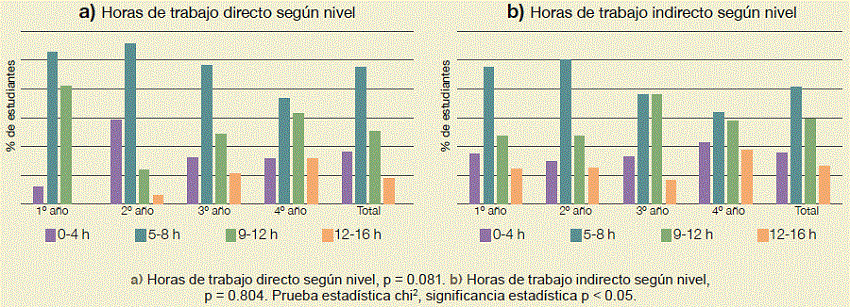 Para identificar el tiempo frente al computador, este se dividió en horas directas que correspondían a la participación en clases o talleres; y en horas indirectas que representaban al tiempo de estudio y realización de trabajos referentes a la carrera. Como se observa en la figura 2, en relación a las horas directas, el 47.6% de los estudiantes está frente al computador entre 5-8 horas; el 25.4%, entre 9-12 h; y el 18.3%, entre 0-4 h. Al segmentar por niveles, más del 50% de ellos estaría entre 12-16 h frente al computador en clases; sin embargo, ninguno de primer año se encontraba en esta categoría (figura 2A). En relación a las horas indirectas, el 40.5% de los estudiantes estaba entre 5-8 h frente al computador en estas actividades, seguido por el 29.4% que lo utilizaba entre 9-12 h. Según los niveles, nuevamente el 4º año presenta la mayor prevalencia en el rango superior de horas con un 40%; los estudiantes de primer año son los que utilizan menor horas de trabajo indirecto (figura 2B). No se observa una relación significativa tanto en las horas directas (p = 0.081) como indirectas (p = 0.804) según el curso.