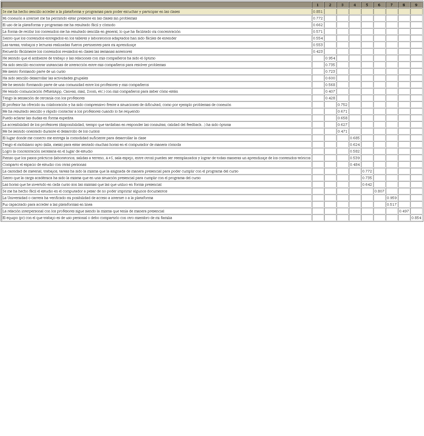 El resultado de KMO fue de 0.459. Al analizar la varianza total explicada con 4 factores se responde a un 54.8% de la varianza. Se observan las 4 dimensiones; sin embargo, algunas preguntas de la dimensión 3 y 4 quedaron excluidas (tabla S1).