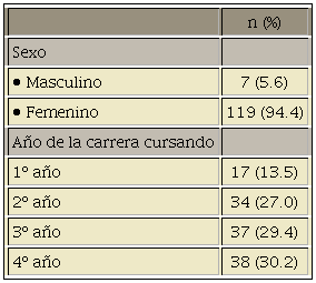 La encuesta fue respondida por 126 estudiantes de la carrera de Nutrición y Dietética. Al describir las variables sociodemográficas, se observa en la tabla 1 que el 94.4 % de la población fueron mujeres y el 13.5 % corresponden a alumnos de 1° año, el cual fue el nivel con menor porcentaje de respuesta.