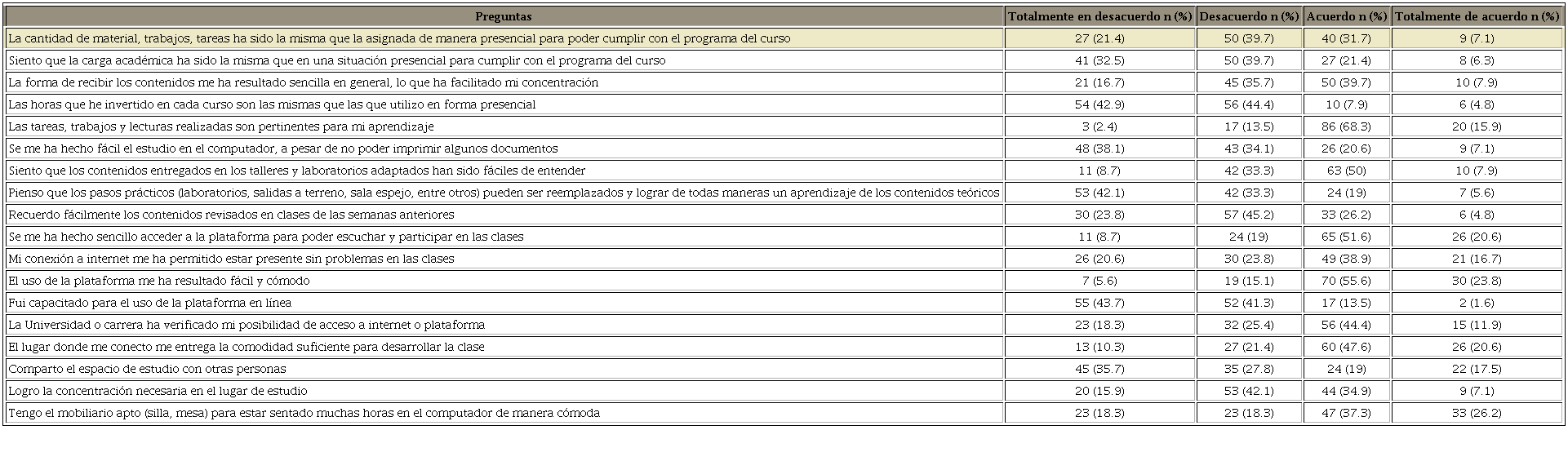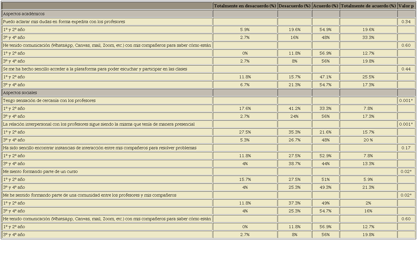 Conclusiones: La percepción de los alumnos es positiva con respecto a los aspectos académicos; sin embargo, han expuesto baja aceptación en aspectos sociales como la relación con otros compañeros. Además, según la percepción de los estudiantes, las actividades prácticas y de trabajo clínico no serían reemplazables por metodologías en línea.