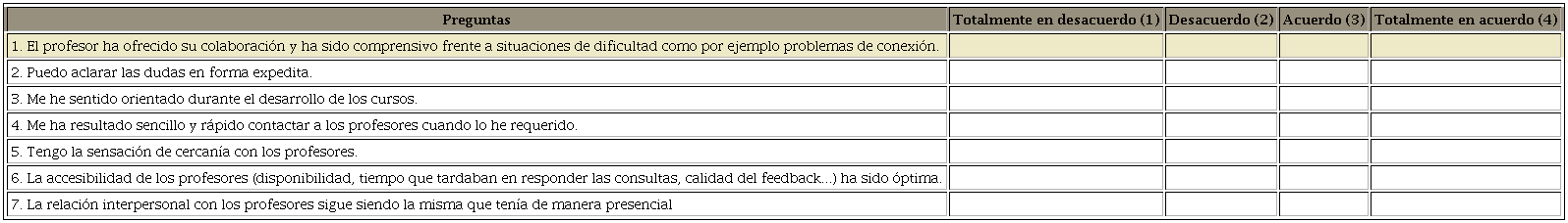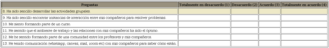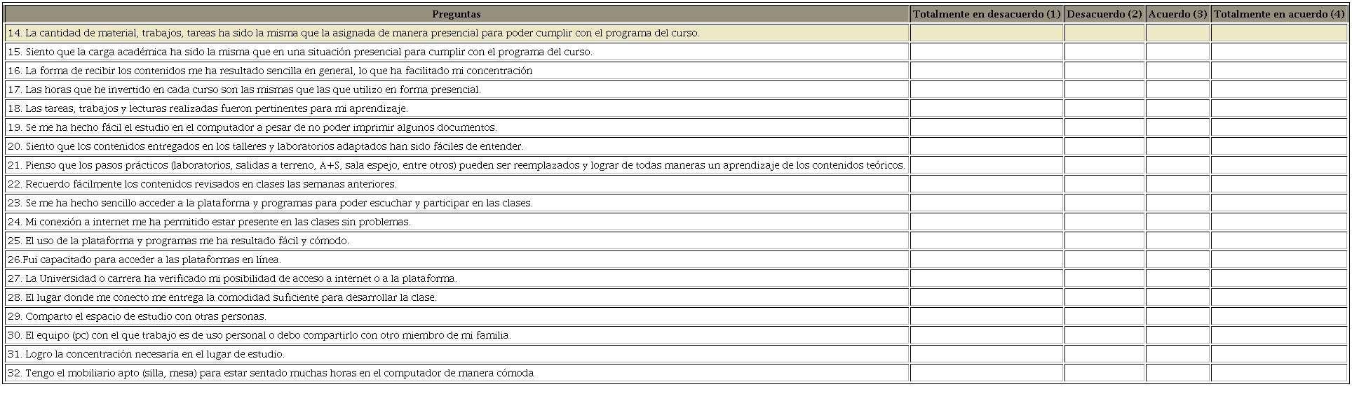 Este proceso resultó en un cuestionario de 32 afirmaciones construidas en una escala de Likert de 4 niveles: totalmente en desacuerdo, desacuerdo, acuerdo y totalmente en acuerdo. Además en torno a objetivos específicos planteados se dividieron los ítems en 4 dimensiones: interacción con profesores (7 ítems), interacción entre pares (6 ítems), metodología (9 ítems) y conexión (10 ítems). Este cuestionario fue aplicado junto con 17 preguntas relacionadas con la descripción sociodemográfica de la población.