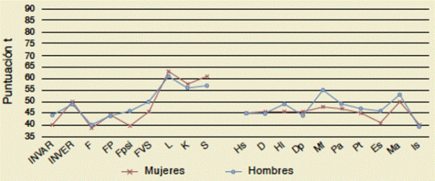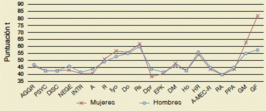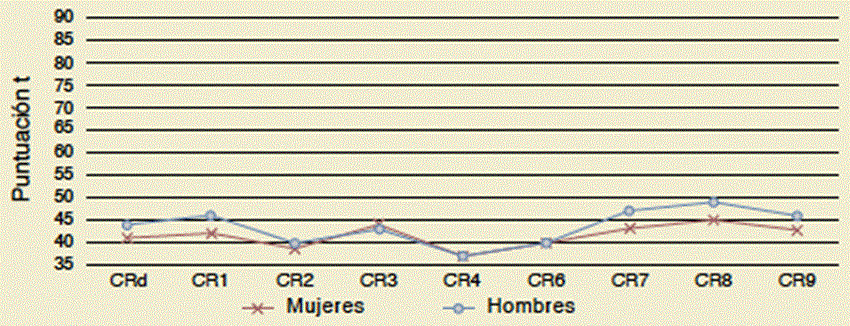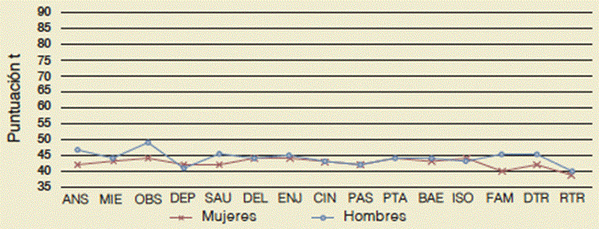 Las puntuaciones t se ubicaron dentro del límite de normalidad de t40 a t65 (figura 1 a 4). Al realizar las comparaciones entre hombres y mujeres, no hay diferencias estadísticamente significativas.