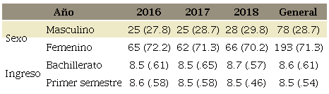 Se estudiaron a 271 alumnos que se presentaron al proceso de selección e ingreso a la licenciatura. El 71.2 % (n = 193) fueron mujeres y 28.8% (n = 78) hombres; la media de edad fue de 18 años con una desviación estándar de 1.7, el rango de edad fue de 17 a 29 años teniendo el 82.3% (n = 223) entre los 17 a 19 años. El tipo de ingreso por pase reglamentado fue del 64.2% y el 22.1% por concurso de selección, mientras que el 13.7% se distribuye por cambio de carrera o segunda carrera. El ingreso a partir del año 2016 a la licenciatura es indirecto por lo que la procedencia de los alumnos es del 25.8% de enfermería, el 20.7% de cirujano dentista y el 15.5% enfermería y obstetricia.