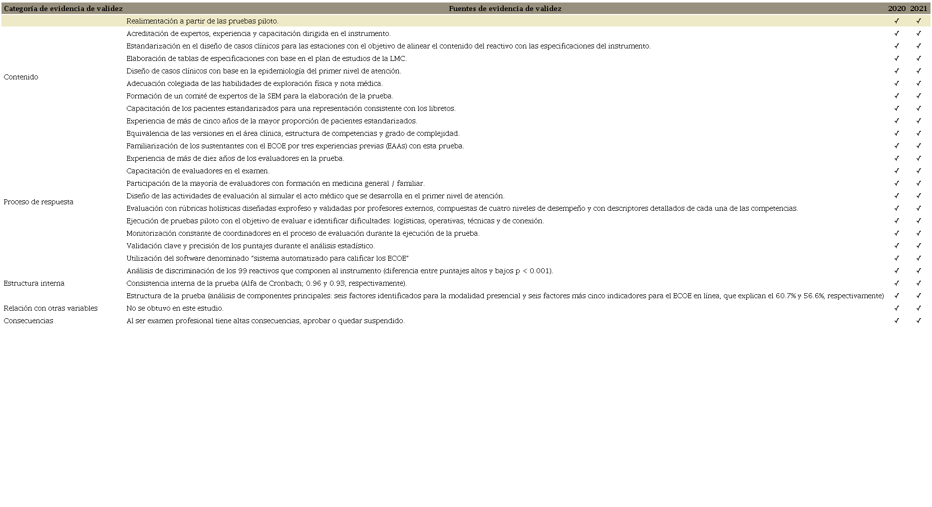 Evidencia de validez de contenido: En el diseño de ambas modalidades del ECOE se hace referencia a la relación entre el comportamiento presentado por el sustentante entre las competencias del plan de LMC evaluadas y cómo se representan estas en las estaciones que conforman el examen. Esto se realizó con la verificación de los contenidos por el juicio de expertos en el área (evaluadores y pacientes estandarizados).