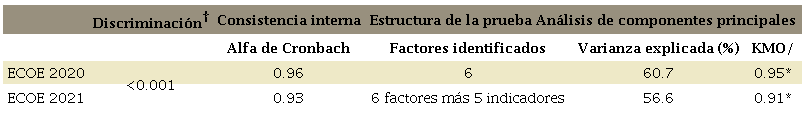 Resultados: Ambas modalidades de ECOE constaron de seis estaciones de 20 minutos. Se evaluaron los 99 reactivos que integran la totalidad de las seis competencias evaluadas y discriminaron a <0.001 entre puntajes altos y bajos. Se identificaron seis factores que explican el 60.7% de la varianza en el ECOE presencial, y seis factores más cinco indicadores en la modalidad en línea con una varianza explicada de 56.6%. El Alfa de Cronbach fue 0.96 para el ECOE presencial y 0.93 para la modalidad en línea.