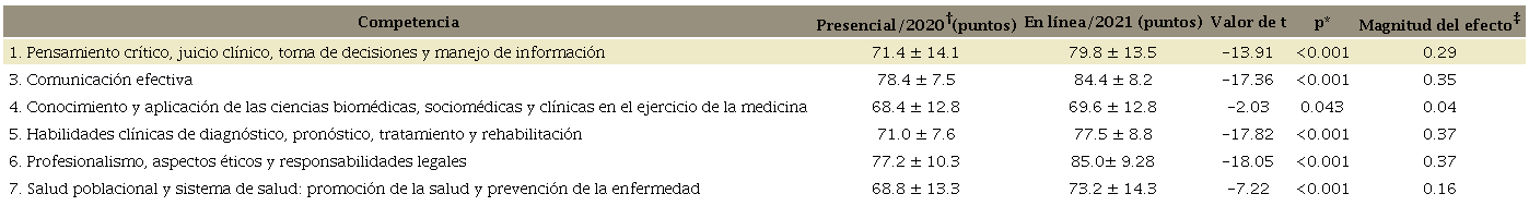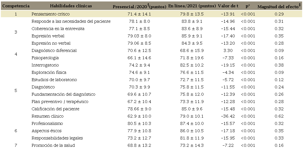 Se calcularon los puntajes en una escala máxima de 100 puntos. A pesar de que hubo diferencias estadísticamente significativas a favor del ECOE en línea, solamente las competencias 3, 5 y 6 tuvieron una magnitud del efecto mayor a 0.3; en contraste, las competencias 1, 4 y 7 tuvieron baja magnitud del efecto (r ≤ 0.3). Asimismo, de las 19 habilidades clínicas evaluadas, en nueve se observaron diferencias estadísticamente significativas y magnitud del efecto alto con mayor puntaje para la modalidad en línea; por ejemplo, en las habilidades de interrogatorio y resumen clínico tuvieron r = 0.38 y r = 0.62, respectivamente. Por otra parte, la exploración física, que fue modificada para el ECOE en línea, presentó diferencia estadísticamente significativa con respecto al ECOE presencial; sin embargo, tuvo magnitud del efecto bajo (r = 0.09) (tablas 3 y 4).