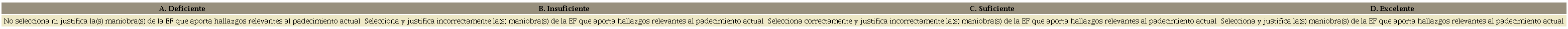 Tanto los casos clínicos como las rúbricas que se utilizaron para la modalidad en línea se diseñaron con base en el ECOE presencial. Se revisó la redacción y las cuestiones técnicas de cada uno de los materiales utilizados. En cada uno de los casos se precisó la adecuación de la exploración física para evaluar la habilidad clínica, en este sentido, llegado el momento del acto médico, los sustentantes mencionarían y justificarían de forma verbal las regiones a explorar, los procedimientos específicos a realizar y la descripción de las maniobras a efectuar. Si eran pertinentes, el evaluador proporcionaría al sustentante, los datos requeridos y no más información. Se sustituyó el rubro de la nota médica por un “resumen clínico verbal” para sintetizar los datos más relevantes de la entrevista clínica, enfocándose en el mismo formato de nota médica (SOAP), justificando el o los diagnósticos y el plan preventivo-terapéutico.