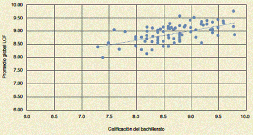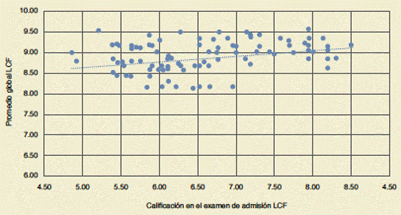 Con respecto al proceso de selección, el desempeño de quienes ingresan a la LCF en el examen de conocimientos es bajo, con porcentajes de aciertos que oscilan entre 40 y 67%, se trate de reactivos tradicionales o que evalúan competencias (preocupantemente, en los reactivos de competencias científicas se registran porcentajes menores al 40%). Estos resultados no parecen concordar con los promedios del bachillerato de los estudiantes seleccionados (que van de 7.30 a 9.80), ni con el promedio que consiguen en la carrera, nunca por debajo de 8.00. Los análisis de correlación confirman estas discrepancias: el promedio en los estudios de licenciatura muestra una correlación moderada con el promedio del bachillerato, mientras que entre el promedio en la licenciatura y la calificación en el examen de admisión existe una correlación baja.