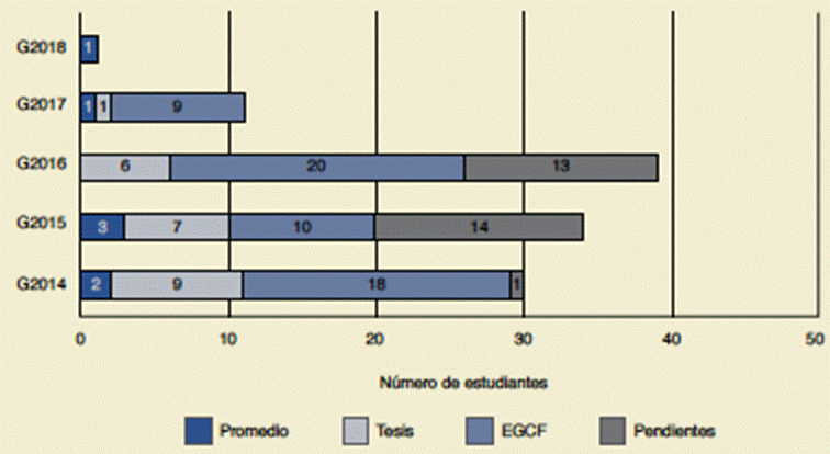 Sobre la titulación, los datos demuestran que las alternativas14 a la elaboración de una tesis -en particular el EGCF- han resultado una válvula de escape para aquellos que no están interesados en elaborar una tesis o que requieren incorporarse al mercado laboral lo antes posible. Es interesante que, a pesar del énfasis existente en el Plan de Estudios sobre formar profesionales con la capacidad de investigar científicamente el delito, bastantes estudiantes no deciden consolidar su formación como científicos a través de una tesis y la investigación que ésta implica. Aún con esta opción, a partir de la generación 2015, una proporción considerable de estudiantes no ha cumplido con el trámite de la titulación, no obstante contar con la totalidad de los créditos. Las razones detrás de la negativa a optar por la tesis, así como del retraso en obtener el título, son dos temas que ameritarán una investigación más a fondo, dada la trascendencia para las perspectivas laborales de los pasantes.