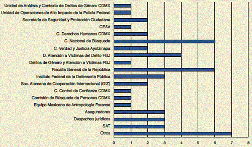 Actualmente el 57% de los titulados se encuentra laborando en instituciones de justicia y derechos humanos (figura 4) y 3 cursan estudios de posgrado en áreas de ciencias y psiquiatría. La información procedente de la inserción laboral de los primeros egresados ha resultado fundamental para precisar la caracterización del perfil del científico forense.
