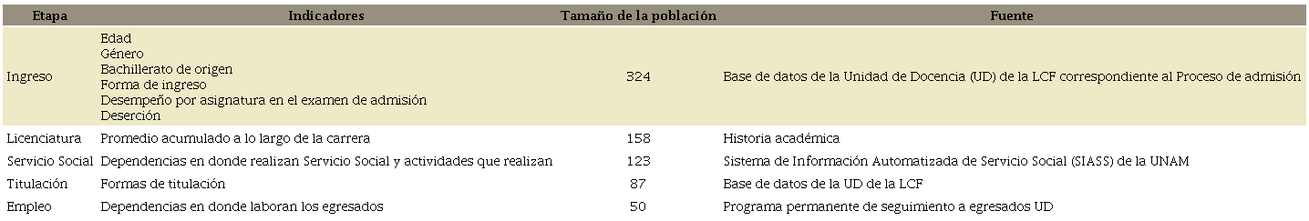 El origen de la información del presente trabajo es la base de datos institucional de la LCF, la cual incluye a todos los estudiantes que han ingresado a la licenciatura desde la primera generación (2014). No se trata de un estudio completamente transversal o longitudinal, pues dependiendo del indicador que queramos señalar, tendrá un diferente tamaño de muestra. En el caso de los procesos de selección, por ejemplo, fueron considerados todos los estudiantes que ingresaron a la licenciatura, sin considerar si egresaron o desertaron. Los indicadores utilizados, así como el número de estudiantes tomados en cuenta, se resumen en la tabla 1.