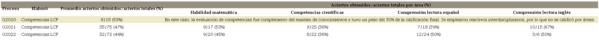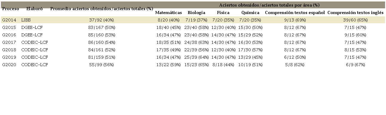 Independientemente del tipo de examen, el desempeño de los aspirantes (que se resume en las tablas 2 y 3) es más bien bajo, oscilando entre 40 (en la generación 2014) y 56% (en la 2020). Los mejores resultados se observan consistentemente en la comprensión de textos en español; los peores, en matemáticas, física y química. Desde la sustitución de los reactivos enfocados en evaluar conocimientos por aquellos enfocados en competencias, se ha registrado un descenso en el promedio de aciertos. En este nuevo tipo de examen, la sección de competencias científicas registra los menores puntajes, de 36% de aciertos.