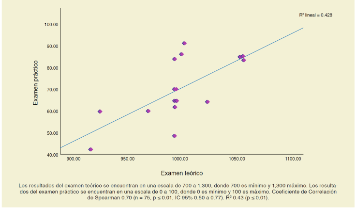 Resultados: Participaron 75 estudiantes. En escala de 700 a 1,300, la calificación del examen teórico fue 1,014.62 ± 26.38. En escala de 0 a 100, la calificación del examen práctico fue 69.18 ± 13.93. La correlación fue 0.70 (p ≤ 0.01, IC 95% 0.50-0.77). R2 0.43 (p ≤ 0.01). Este estudio evidenció una correlación moderadamente alta entre la evaluación teórica en línea y la evaluación práctica por telesimulación. El resultado de la fase teórica determinó un 43% el resultado de la fase práctica.